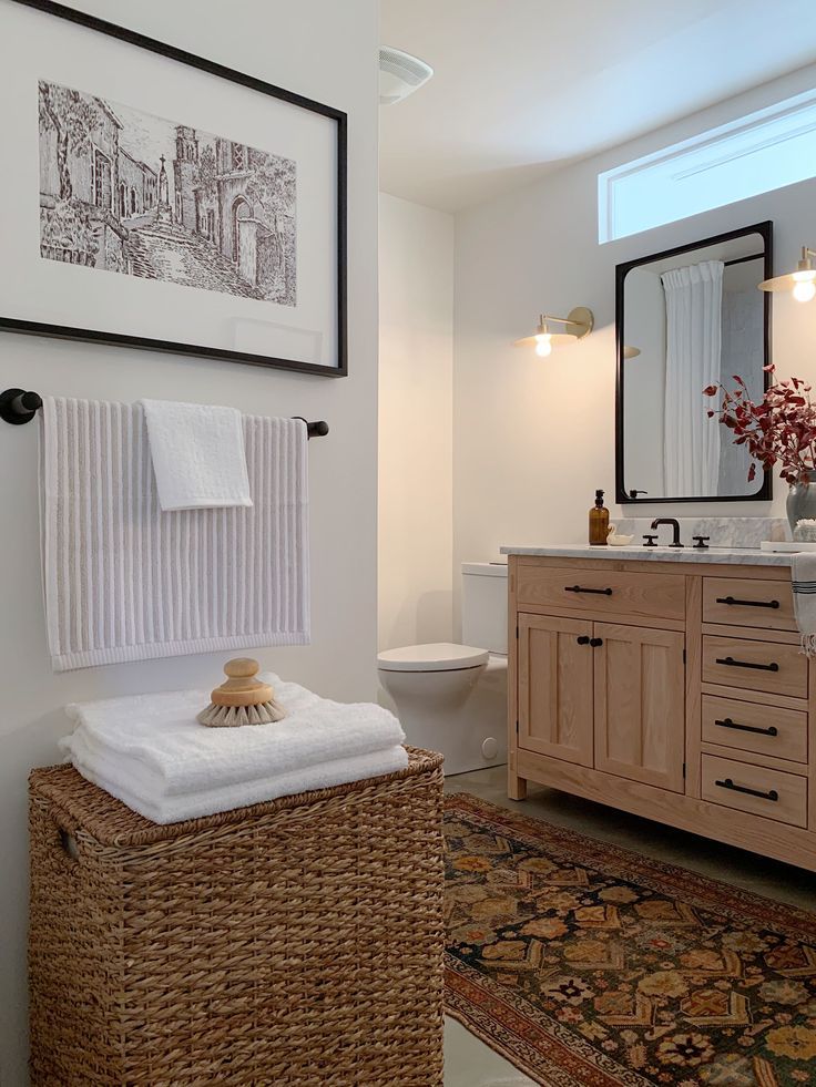 Scandinavian style gives a simple and natural impression to the bathroom. You can use bright colors like white or navy blue with wood or stone accents to give your bathroom a more natural impression. In addition, you can add accents such as pendant lights or rattan baskets to give your Scandinavian bathroom a cozier impression.